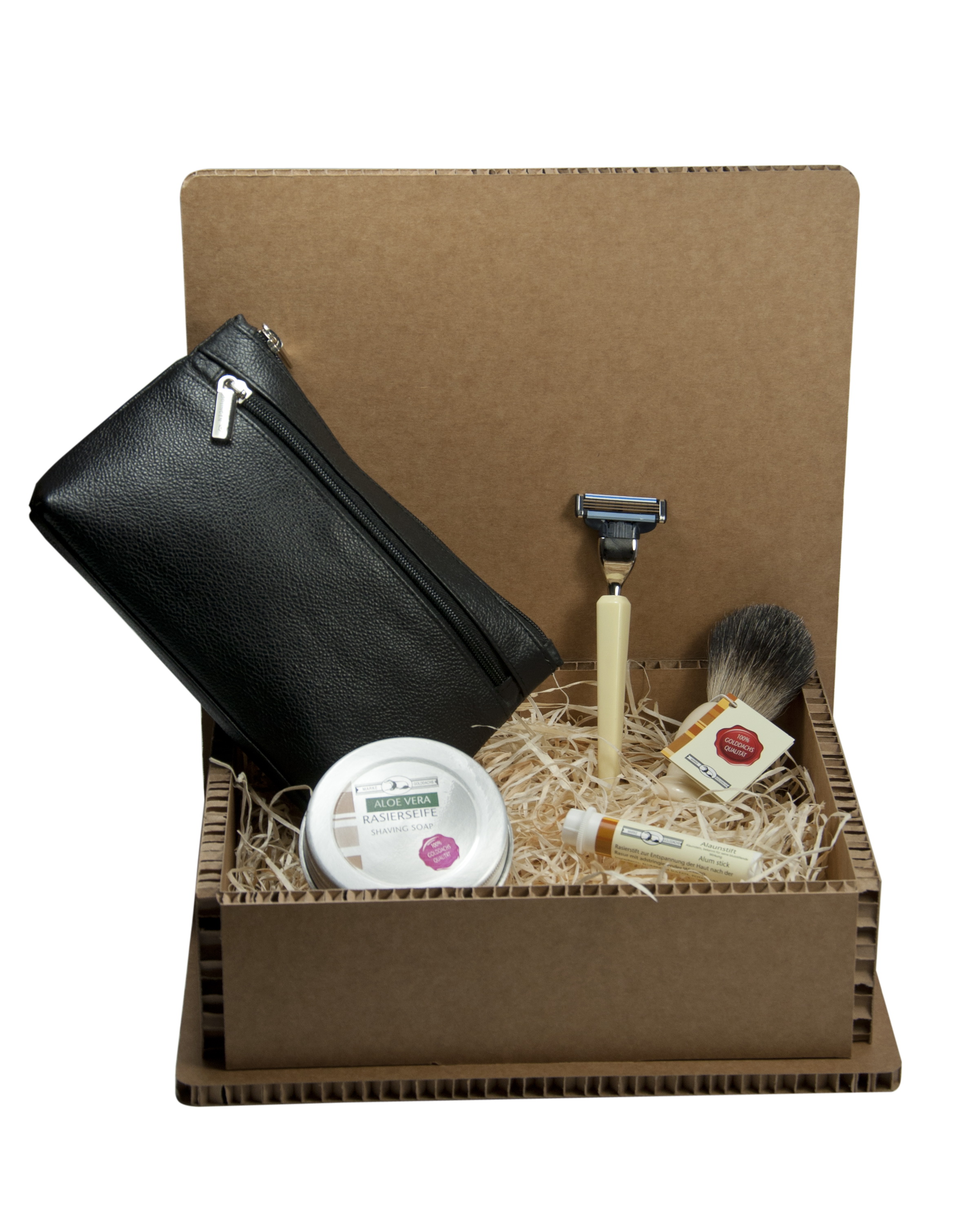Geschenkset bestehend aus Leder-Rasiertasche,