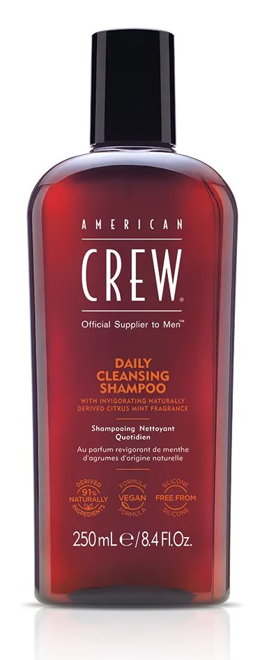 American Crew Daily Cleansing Shampoo 250ml Care & Body Das American Crew Daily Cleansing Shampoo 1000ml ist ein sanft reinigendes Shampoo, das überschüssiges Fett und Verunreinigungen von Haar und Kopfhaut entfernt. Mit feuchtigkeitsspendendem Vitamin B5 für gesundes, glänzendes und geschmeidiges Haar. Frei von Silikonen und angereichert mit einem erfrischenden Citrus-Minze-Duft. Ideal für die tägliche Anwendung und zu 91 % aus natürlichen Inhaltsstoffen. Highlight Gründliche Reinigung Enthält Vitamin B5 für gesunde, weiche und geschmeidige Haare Frei von Silikonen für eine natürliche und sanfte Pflege Menthol sorgt für eine angenehme Kühlung und Erfrischung der Kopfhaut Inhalt: 1000 ml Beschreibung Erleben Sie das American Crew Daily Cleansing Shampoo 1000ml, die ultimative Lösung für eine gründliche und schonende Haarreinigung. Dieses Shampoo entfernt effektiv überschüssiges Fett und Verunreinigungen von Haar und Kopfhaut, ohne das Haar auszutrocknen. Dank der innovativen Emulgator-Formel verwandelt sich die klare Flüssigkeit in einen reichhaltigen, feinporigen Schaum, der tief in die Haarstruktur eindringt und gleichzeitig für ein luxuriöses Reinigungserlebnis sorgt. Angereichert mit Vitamin B5 (Panthenol) spendet das Shampoo intensiv Feuchtigkeit und sorgt für gesund aussehendes, weiches und geschmeidiges Haar. Das Ergebnis ist ein natürlicher Glanz und eine verbesserte Textur. Der natürliche Citrus-Minze-Duft verleiht dem Haar zusätzlich eine erfrischende Note, während Menthol die Kopfhaut angenehm kühlt und belebt. Das American Crew Daily Cleansing Shampoo ist zu 91 % aus natürlichen Inhaltsstoffen hergestellt und frei von Silikonen, was es zu einer idealen Wahl für alle macht, die Wert auf hochwertige und hautfreundliche Pflegeprodukte legen. Es ist perfekt für die tägliche Anwendung geeignet und unterstützt dabei, das Haar sauber, gesund und voller Leben zu halten.